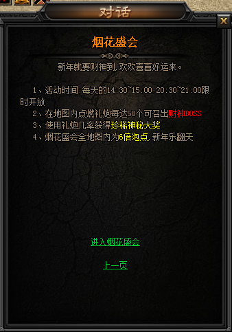 新春佳节到,六倍泡点活动,每天14:30~15:00,20:30~21:00进入烟花盛会,带给你多倍的温暖,多倍的温情,可在主城-活动使者处查看