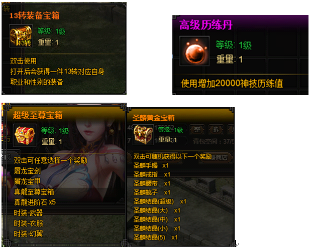 圣麟黄金宝箱*5 | 13转转装备宝箱*1 | 超级至尊宝箱*1 |
